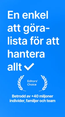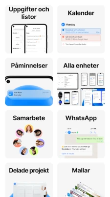 Upplev en oöverträffad känsla av kontroll och lugn i din vardag. Any.do är den kompletta lösningen som transformerar kaos till ordning för över 40 miljoner individer, familjer och professionella team världen över. Föreställ dig en plattform där dina att-göra-listor, dagliga planer, påminnelser och kalender smälter samman i en sömlös upplevelse. Any.do är designad för att vara din personliga assistent som säkerställer att ingenting faller mellan stolarna, oavsett hur hektiskt ditt schema blir. Det är inte undra på att ledande publikationer hyllar Any.do som en "MÅSTE-HA APP" för en mer produktiv tillvaro.