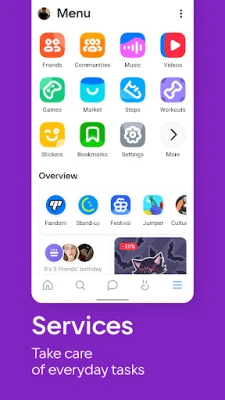 VK kopplar samman miljontals människor globalt. Utforska obegränsade funktioner för kommunikation, underhållning och affärer. Lyssna på musik, titta på videor, följ din hälsa, spela spel och shoppa – allt på en plattform för att dela nyheter från hela världen.